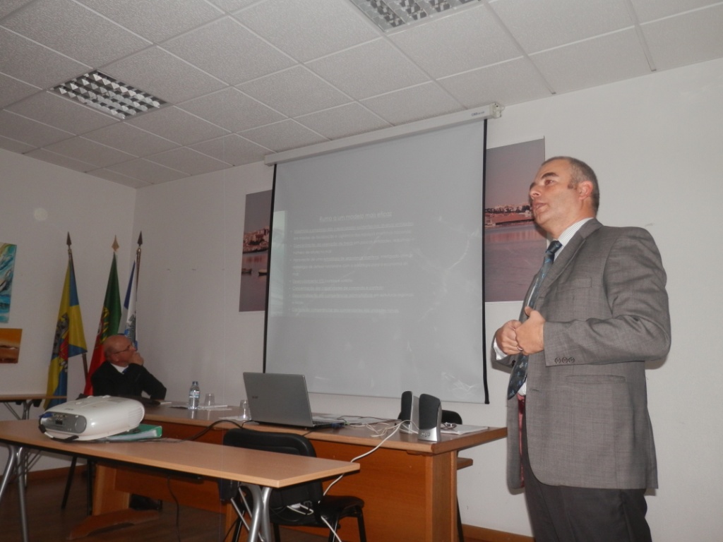 O professor Luís Lapa fez a introdução do currículo do palestrante, Comandante Júdice Pargana, que de seguida iniciou a apresentação do tema e a agenda dos parâmetros que iriam ser abordados.