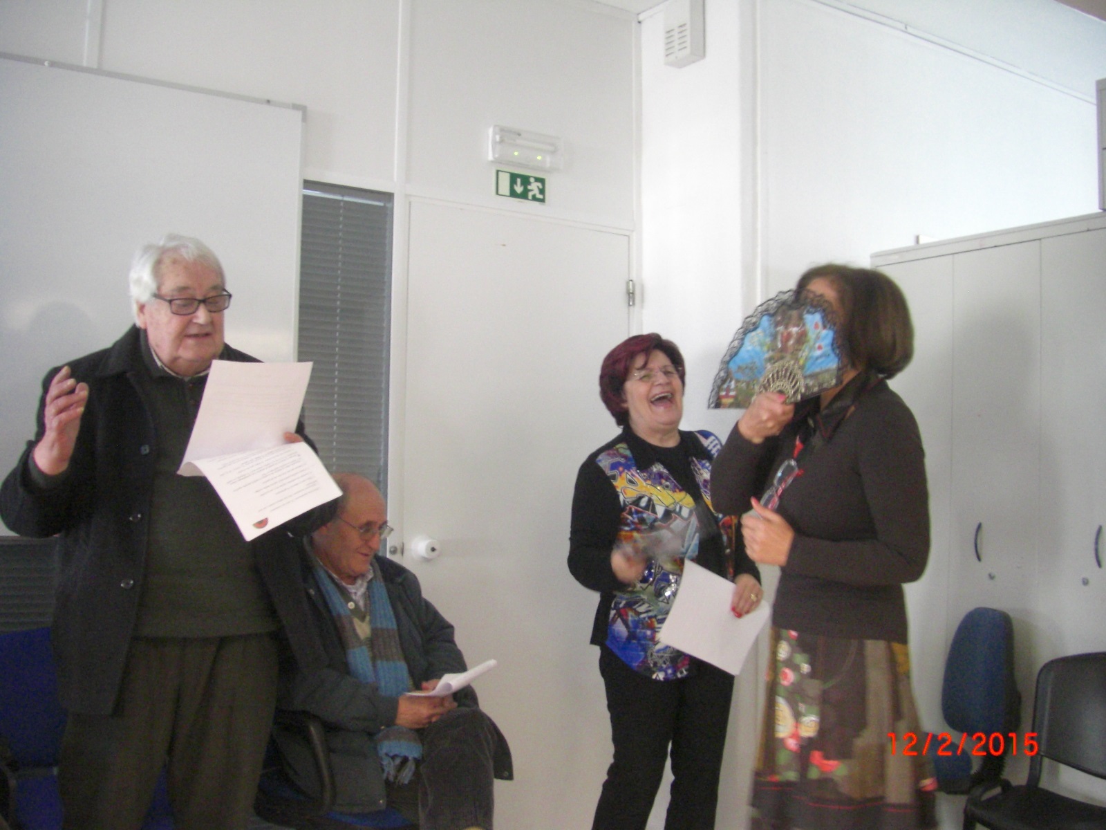 Foi muito agradável ver os alunos de Italiano e de  Espanhol representar as várias situações da comunicação gestual, usando o objeto, "leque", como símbolo da dramatização, com o acompanhamento musical, do sempre amável, Sr. Amável.