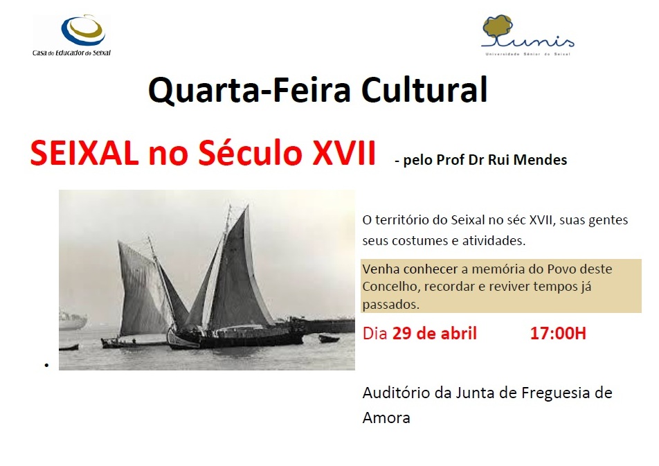 A quarta-feira cultural de 29 de abril, que teve lugar no Auditório da Junta de Freguesia de Amora, foi dedicada ao tema “O Território do Seixal no Século XVII” e esteve a cargo do Dr. Rui Mendes.