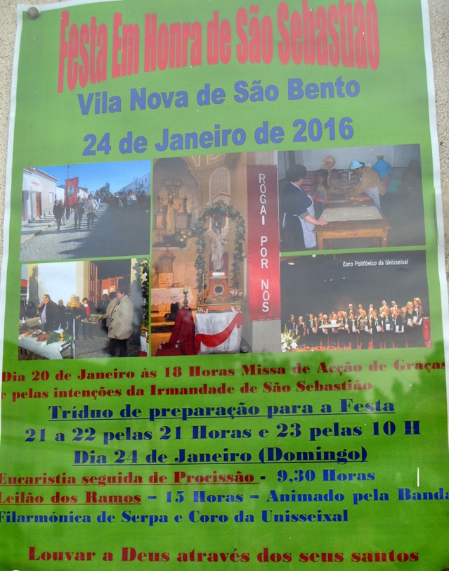 O Coro Polifónico da UNISSEIXAL, deslocou-se no passado dia 24 de Janeiro a Vila Nova de São Bento (Serpa), para participar nas Festas em Honra de São Sebastião. Estas festas são essencialmente religiosas, incluem procissão e oferendas ao Santo de ramos de laranjas, bolos, frangos, leitões etc. que depois são leiloados.