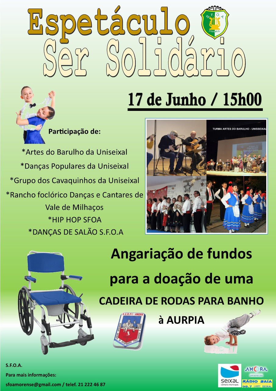 No passado sábado dia 17 de junho 2017, a UNISSEIXAL associou-se  à  SFOA – Sociedade Filarmónica Operária Amorense, para Angariação de fundos destinados à doação de uma cadeira de rodas para banho à URPIA – Amora. Estiveram presentes neste espetáculo solidário os Grupos de Hip Hop e Danças de Salão da SFOA, o Rancho Foclórico de Danças e Cantares de Vale Milhaços e em representação da nossa Universidade Sénior o Grupo das Danças Populares – Prof. Ondina Monteiro, O Grupo de Cavaquinhos do Prof. Mário Fortuna e a Turma das Artes do Barulho do Prof. António Pontes.