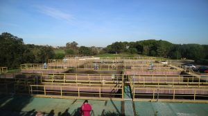 O efluente é conduzido para os tanques de arejamento (tratamento biológico) que promove a depuração da água residual e posteriormente tratamento em Decantadores Secundários.
