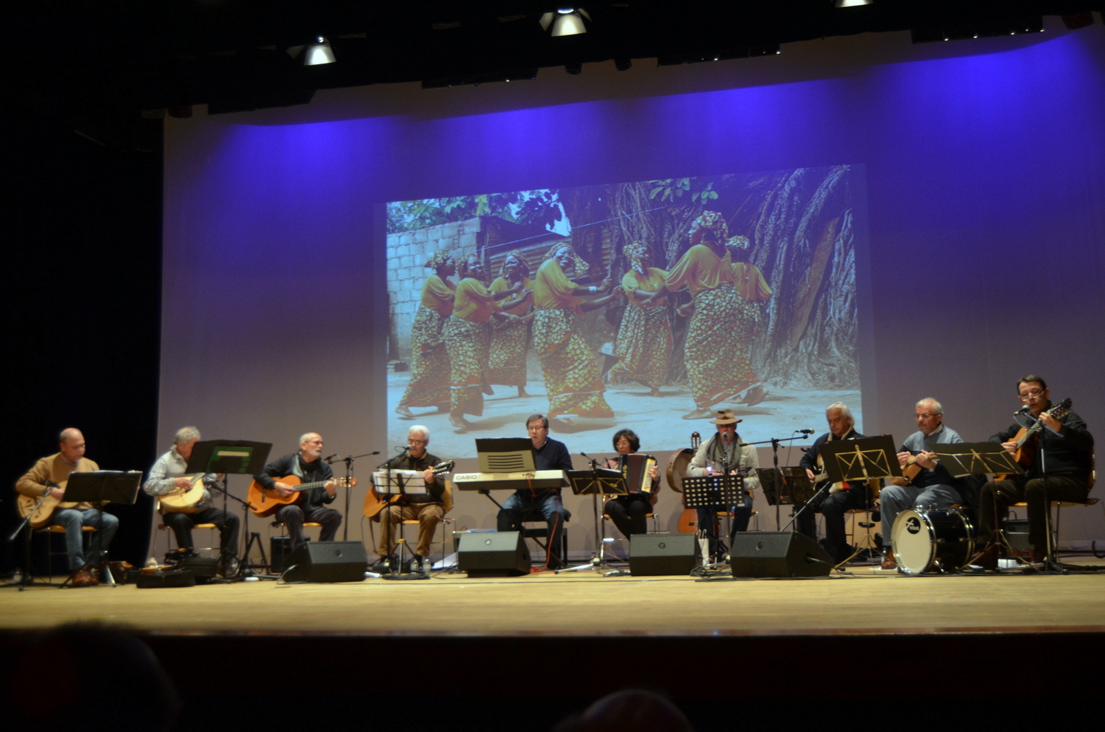 uma interessante banda com os instrumentos que ensinam, a que aliaram vozes afinadas que nos encantaram? Ainda por cima, pegaram num tema muito querido a todos, com uma carga histórica rica, que designaram “Trovas que o tempo deixou”. Cantaram Zeca Afonso, Adriano Correia de Oliveira, José Mário Branco, e não sei quem mais… Sempre acompanhados da projeção de fotos alusivas aos temas, selecionadas pelo prof. de fotografia. E quem dirigia o concerto? Claro, o prof. Pontes, com o seu chapéu de artista e sua veia comunicacional sempre atraente.