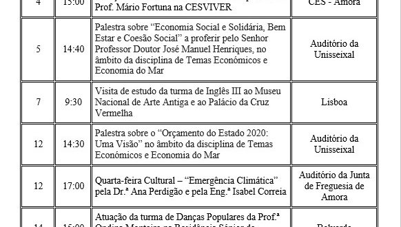 Proteger o nosso Planeta No passado dia 12 de fevereiro de 2020, realizou-se mais uma Quarta-feira Cultural no Auditório da Junta de Freguesia da Amora, sobre a “Emergência Climática”, – Ciência do Estudo do Clima. Estiveram presentes a Reitora Prof. Mariana Mareco e o Vice-Reitor Dr. Natalino Bolas da Unisseixal e como convidada a Palestrante a […]