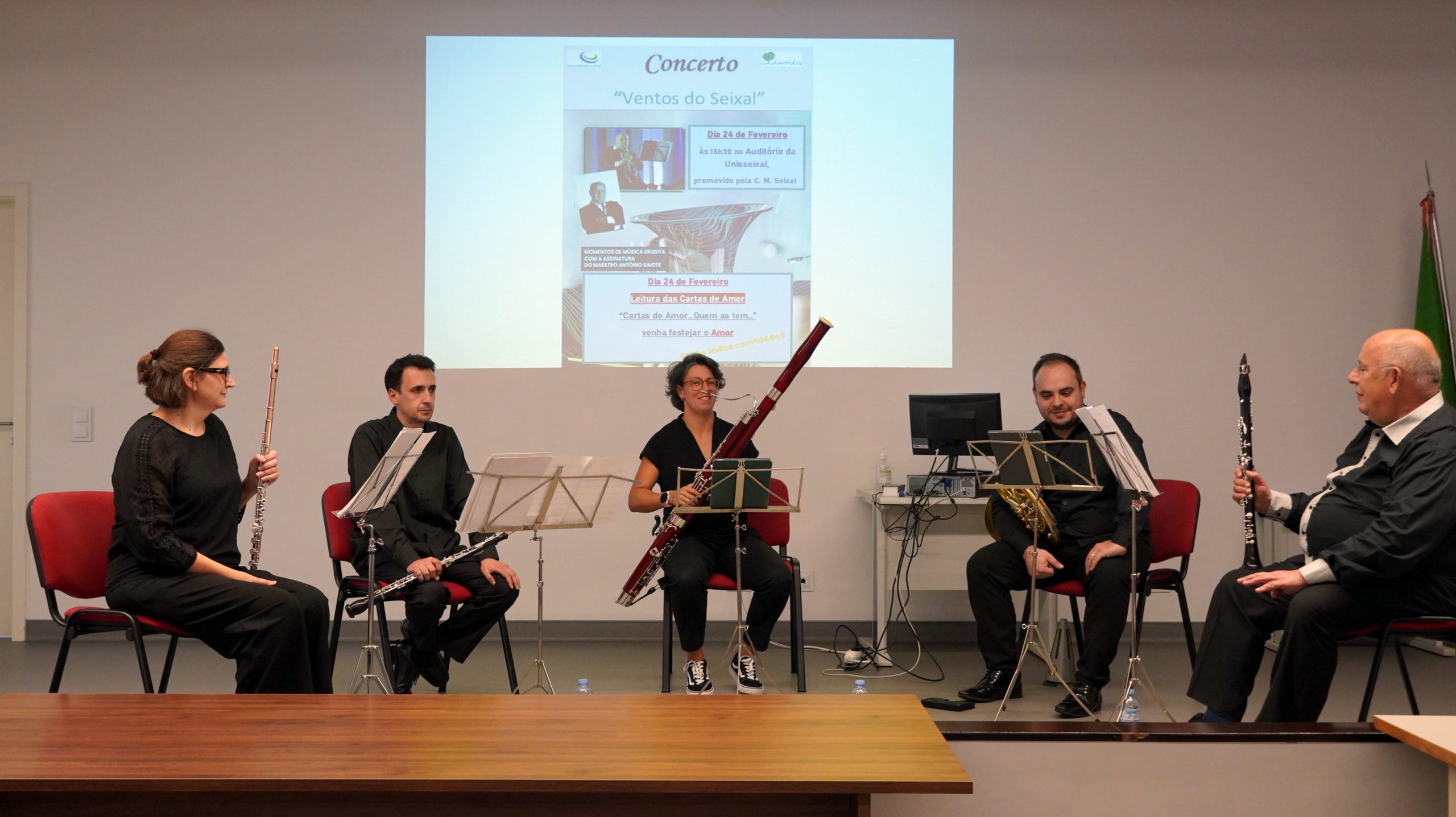 auditório da Unisseixal, um concerto do quinteto de sopros "Ventos do Seixal", perante uma plateia repleta de alunos e professores.