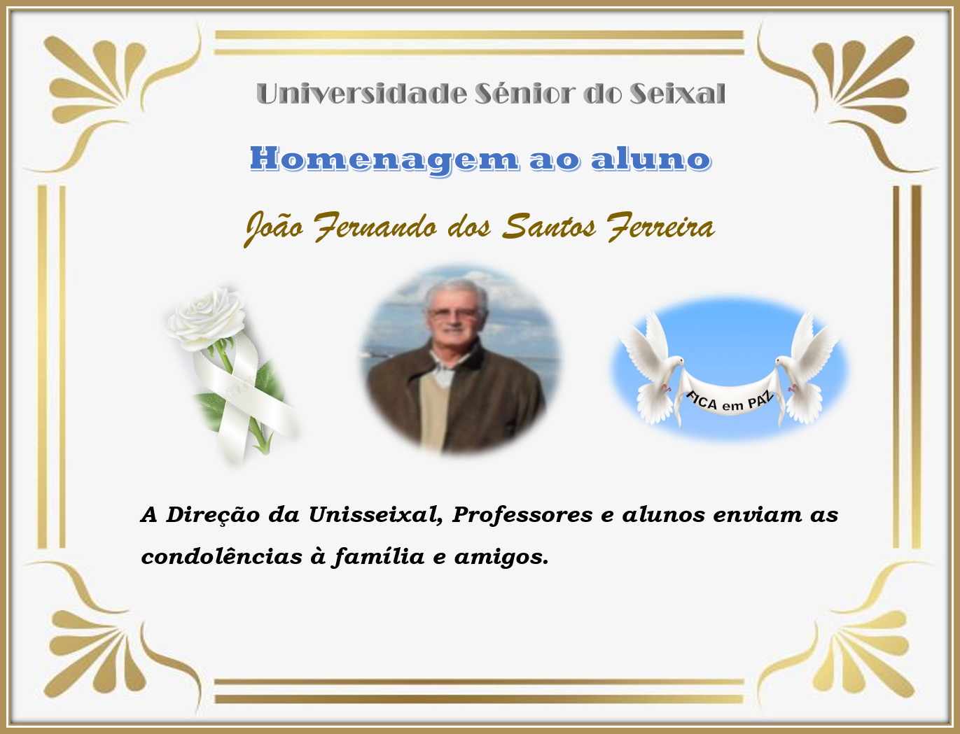Na situação em que nos encontramos, em confinamento e a atravessar um dos momentos mais difíceis a nível do país, gostaríamos de estar presentes junto da família, na despedida deste aluno, amigo e colega. Não sendo possível fica registada esta homenagem em sua memória. “Que tenha o descanso eterno” A Direção da Unisseixal