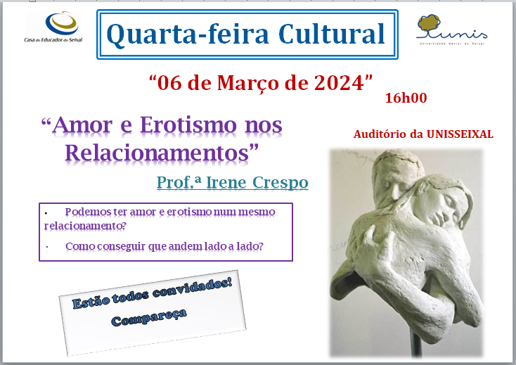 No passado dia 6 de março de 2024, no auditório da Universidade Sénior do Seixal, realizou-se mais uma QUARTA-FEIRA CULTURAL, alusiva ao tema “Amor e Erotismo nos Relacionamentos”, pela professora Irene Crespo. O amor é o que acontece quando estamos de coração aberto. O amor como fluxo energético é: Consciência e Romântico. Um relacionamento saudável […]